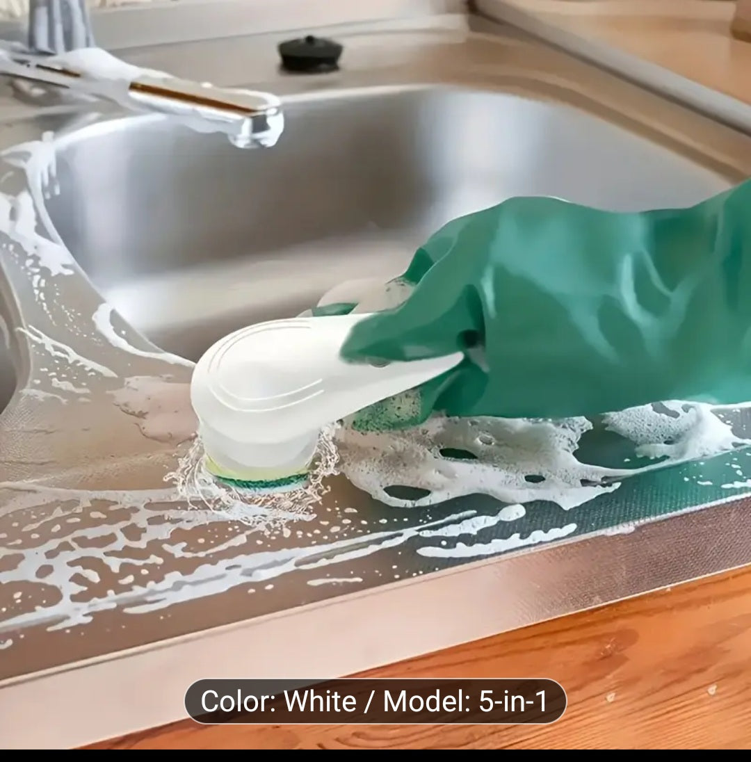 Includes a soft bristle brush, sponge head, scouring pad, microfiber cover, and a stainless steel scrubber – perfect for scrubbing dishes, tiles, bathtubs, sinks, and more. -